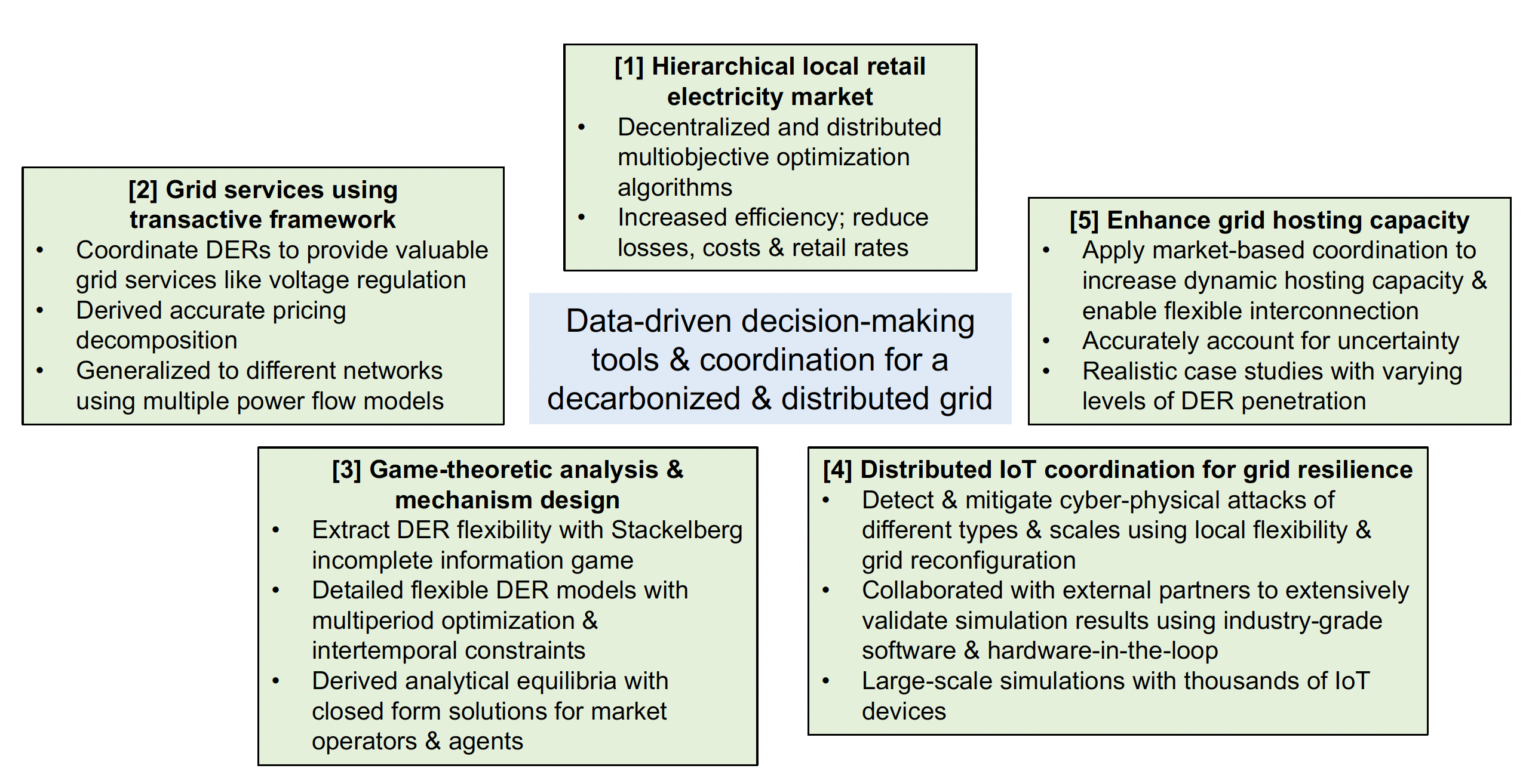 In my PhD, I applied various tools, including distributed & decentralized optimization, game theory, market design & machine learning, to solve challenging planning & operational problems for the future power grid rich in renewables, battery storage & flexible demand (electric vehicles, heat pumps, data centers). I showed that coordinating flexible DERs can significantly lower network costs, losses & consumer electricity prices. I also applied our methods to improve efficiency, hosting capacity, power quality & grid resilience to cyber-physical attacks or outages. You can find my PhD thesis defense slides below: